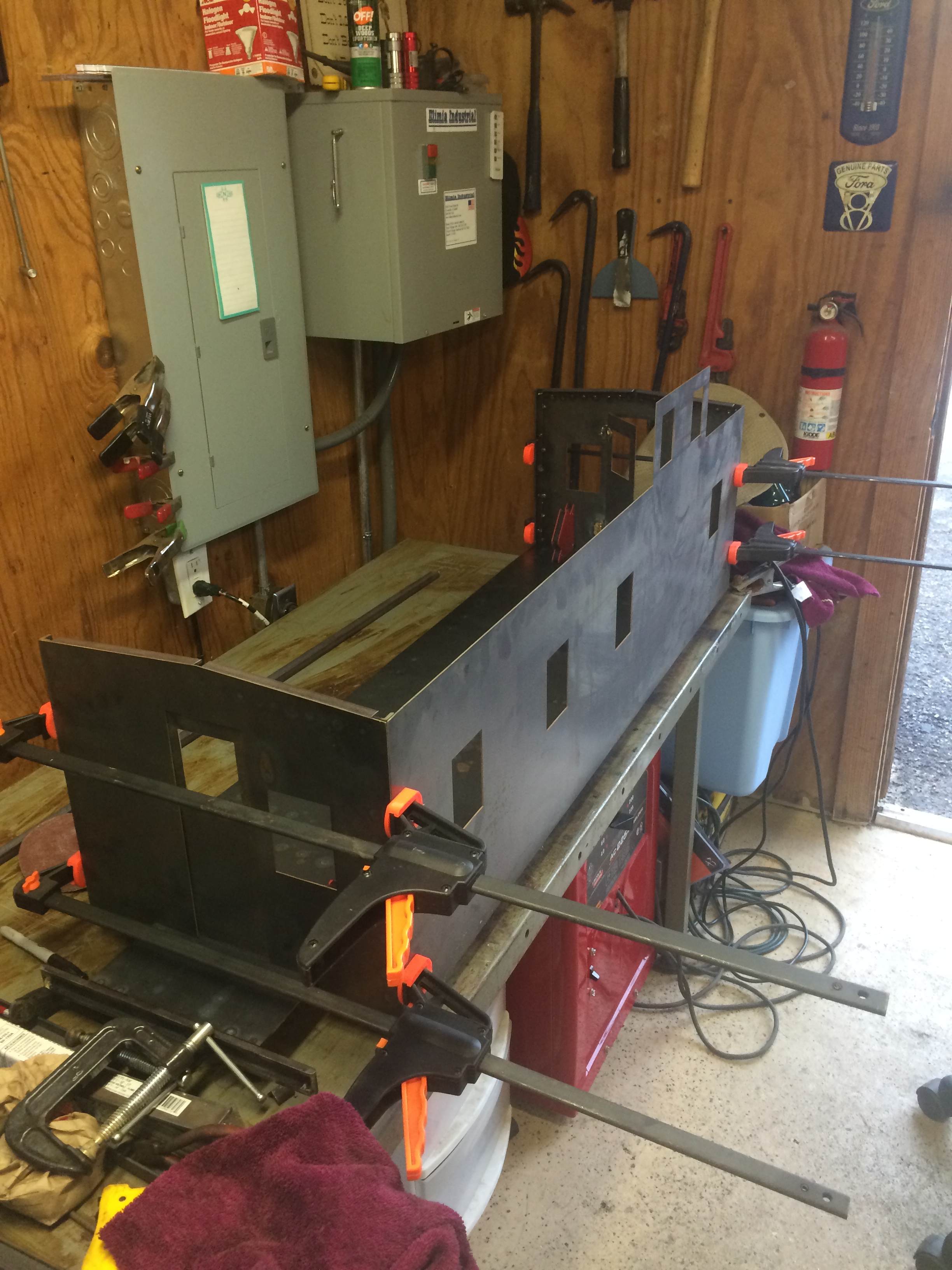 Preparing for welding the four sides together. The clamps are from Harbor Freight, and were made for wood projects, but I found they worked quite well for this project (and I already had them). Photo by Daris A Nevil, April 2015.