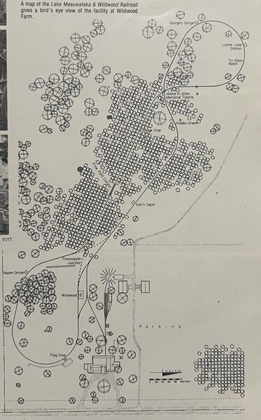 Map of Bill Fitt's Lake Meauwataka & Wildwood Railroad, from Modeltec, May 1984.