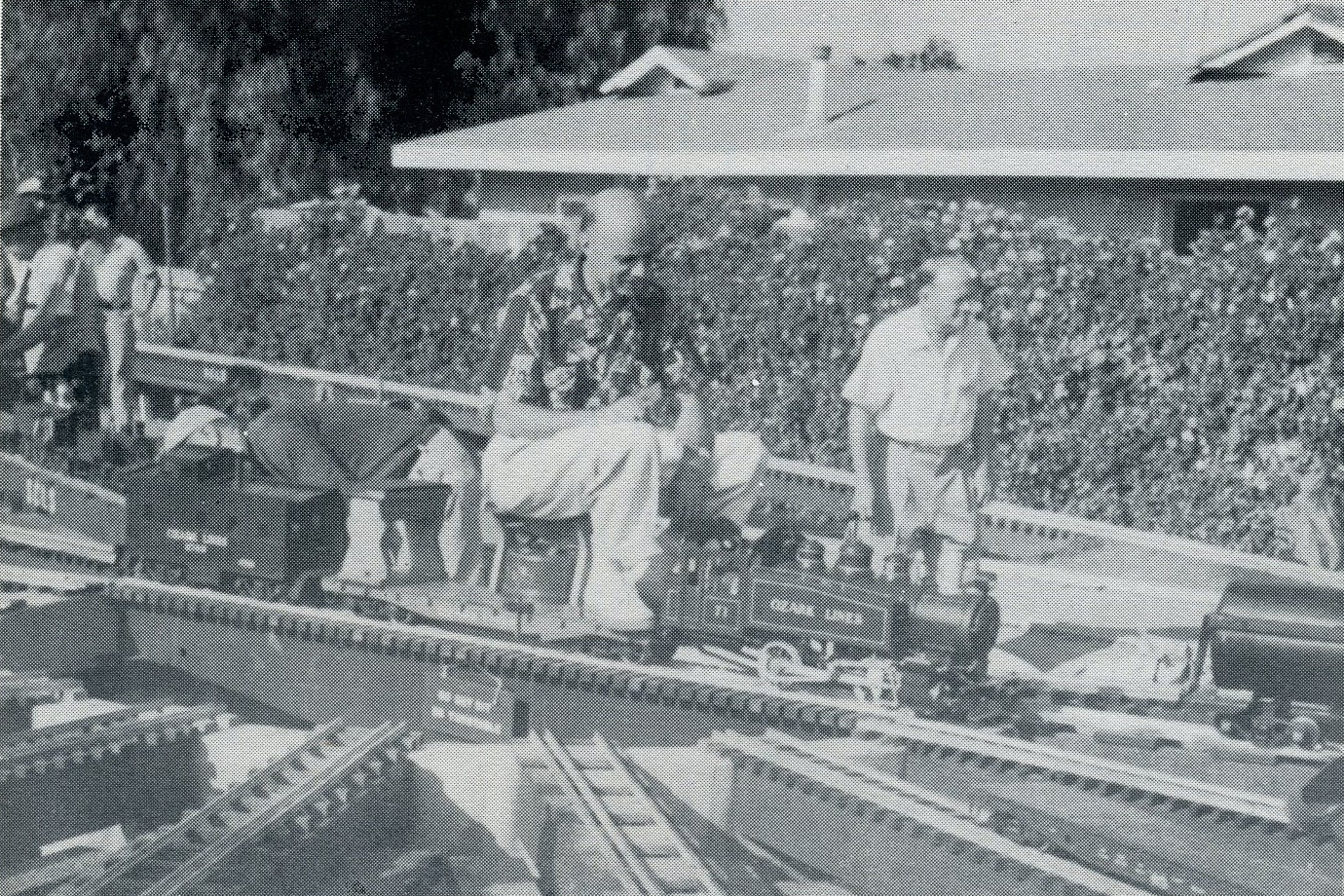 Leo Meyers of St. Louis, MO, on the turn table with his 0-4-0 tanker. Taken at the Southern California Live Steamers track in 1954. This is a beautifully constructed engine and is gasoline fired. From The North American Live Steamer, March 1956.