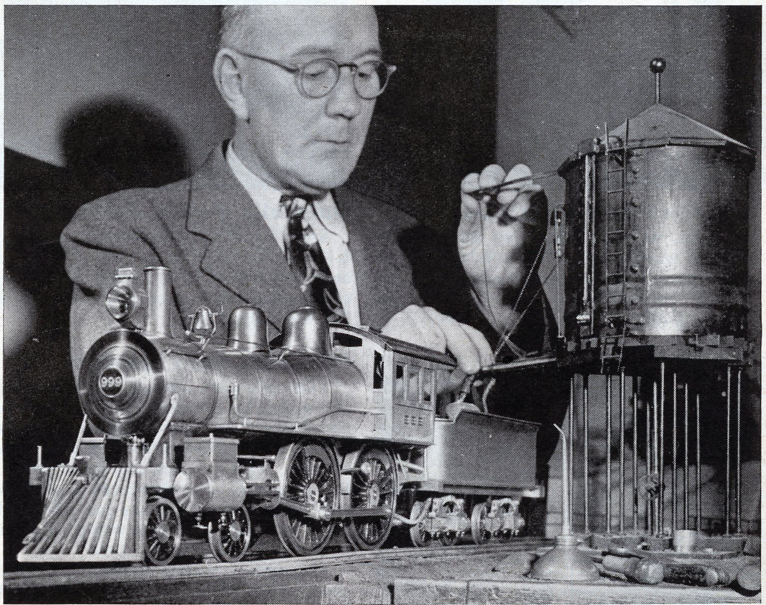 Walter Brown in club's basement workshop, where famous old "999" takes on water from replica of familiar trackside tank. Larger version of water tank will be built for use by members on outdoor track. From Popular Science, October 1951
