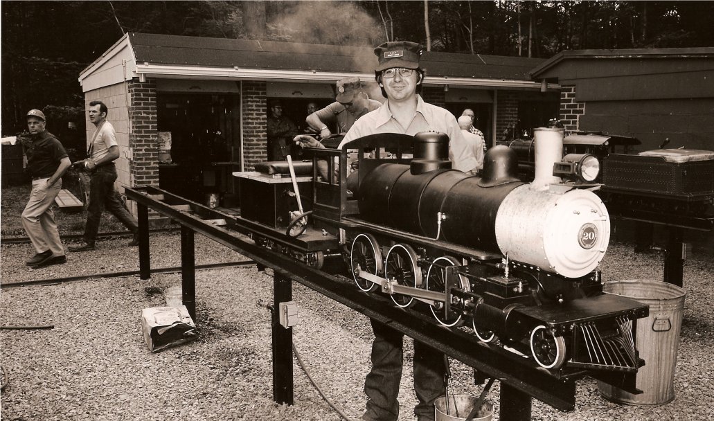 Long time Live Steamer, Marty Knox, with his new 4-6-0 ten wheeler at New Jersey Live Steamers 40th Anniversary Meet, 1983. Marty is now the superintendent for the Hunkleberry 3-foot gauge railroad in Michigan. Marty's claim to fame is building boilers. From http://www.northeastlivesteamers.org/Docs/History/NJLS_50th.html
