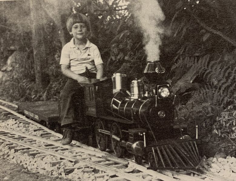 Matthew Potoff, grandson of Ralph Lathrop, engineer of Joe W. White, built by his grandfather. Photo by Ralph Lathrop, 1980. From Live Steam Magazine, October 1980.