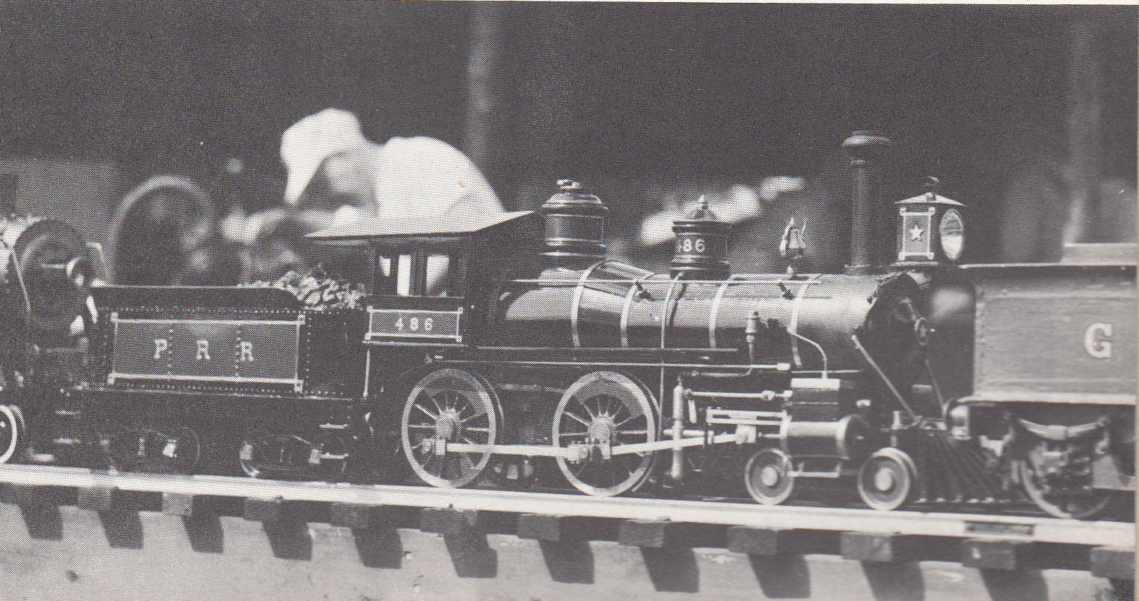Bill Morewood's 3/4 inch scale American which was the fourth locomotive to run on the NELS track as long ago as 1948. BLS Meet hosted by the Pennsylvania Live Steamers, August 1952. Photo by Adrian Buyse. From Live Steam Magazine, June 1972.
