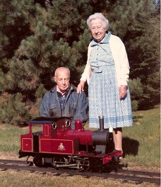 Final inspection by Carl & Mrs. Purinton when the locomotive "Bridgette" was new. October 5, 1974. Photo by Bob Hornsby. From http://www.northeastlivesteamers.org/Docs/History/NELSmem_boxford_1.html