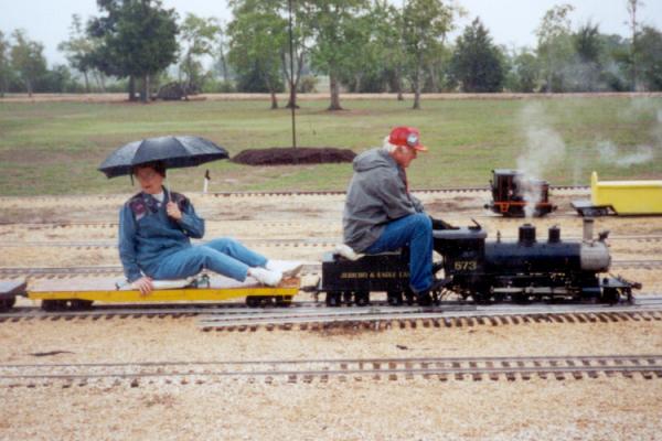 Naomi Sumrall under the umbrella behind Jack Lucks. At the Houston Area Live Steamers, October 2000. From http://www.hals.org/swls/2000.html