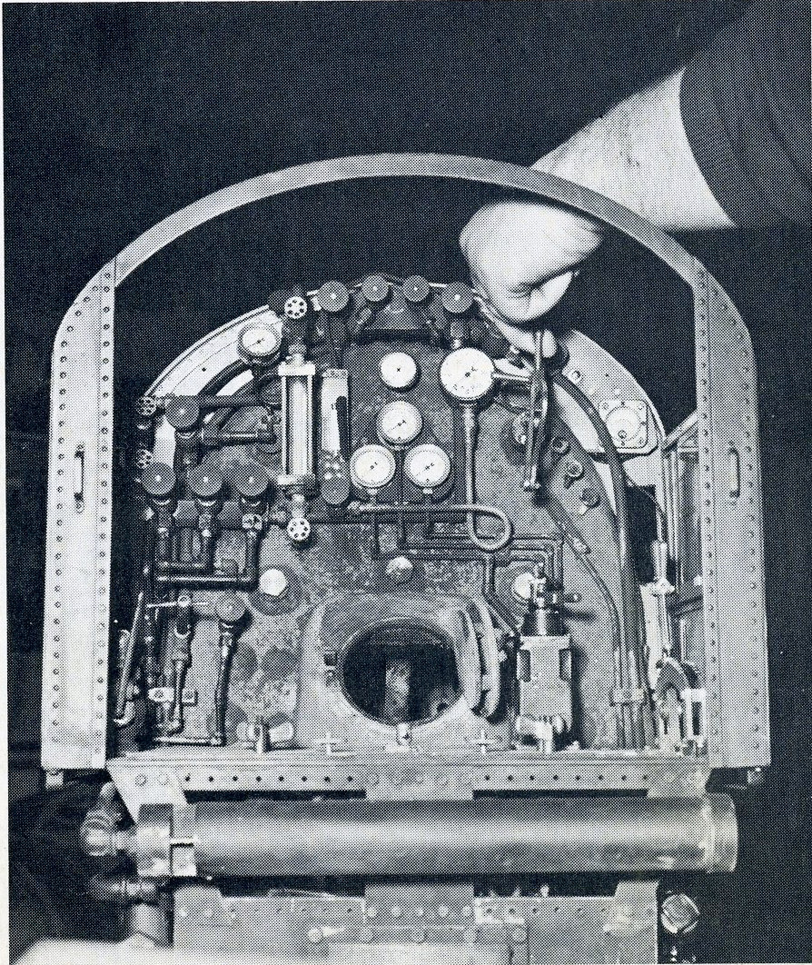 Controls in the cab of a 1-1/2 inch Northern. They're just like those in the parent engine, and all play some part in operating the model. The man's hand is on the throttle. From "Industrial Progress", Volume 9, Number 1.