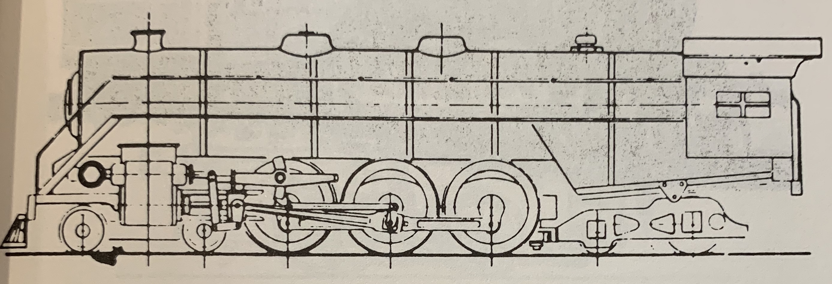Elevation view of 1/4 inch scale, 1.5 inch gauge L35 Hudson by O. Burnaby Bolton as shown in the 1970 Craftsman Catalog of Caldwell Industries.