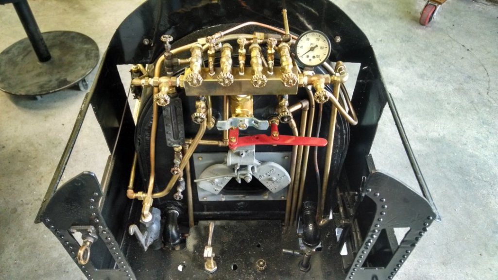 Backhead view of a 1.5 inch scale Pacific. I install dry pipes on my boilers whether coal or oil firing for the turret to help with the atomizer getting as dry steam as possible. Never attach the sight glass to the turret. I'm not hesitant to drill and tap the boiler shell but I always use heavy wall tubing. Photo and text by Vance Nickerson. From https://www.chaski.org/homemachinist/viewtopic.php?f=8&t=105654&p=417594&hilit=backhead#p417594