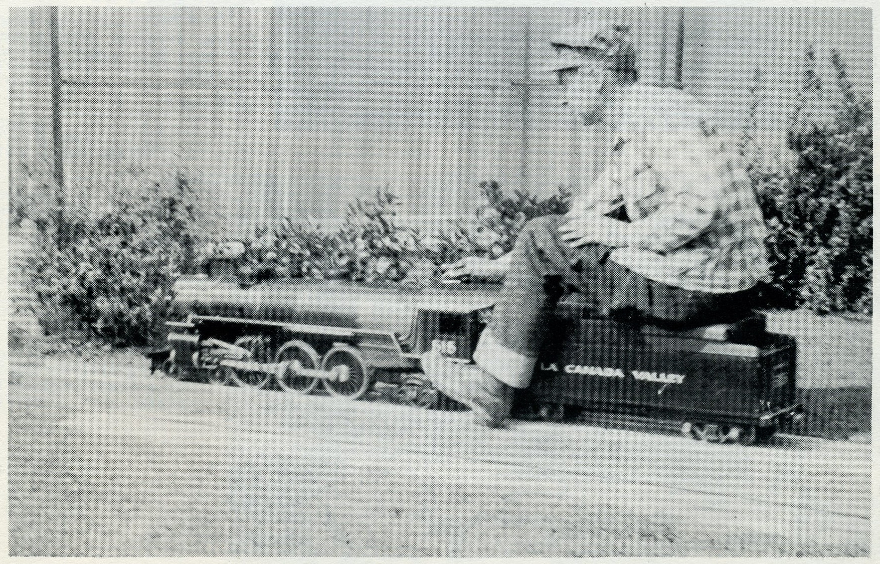 Ollie Johnston at the throttle of his 1 inch scale Pacific at his home track the La Canada Valley R.R. From "The North American Live Steamer", January 1956.