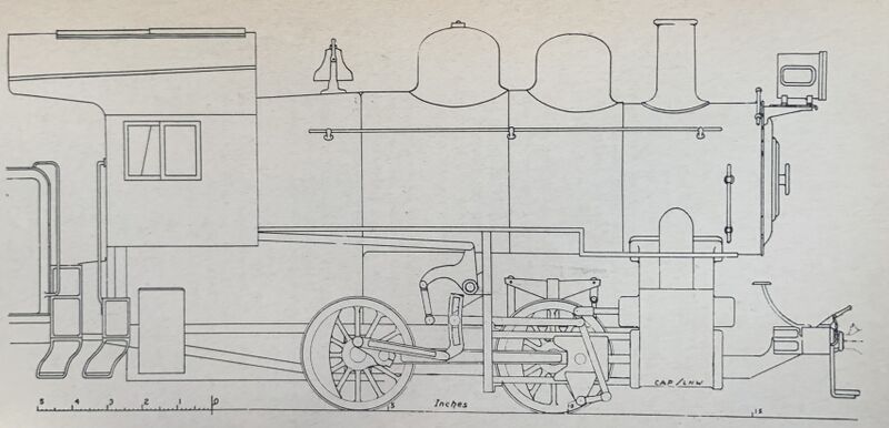 0-4-0 Switching Locomotive, Pennsylvania Class A in 1/4 inch scale. Designed by Charles A. Purinton of Marblehead, Massachusetts. Drawing by Lynn H. Wescott. From “The Model Railroad Cyclopedia”, Second Edition, 1937