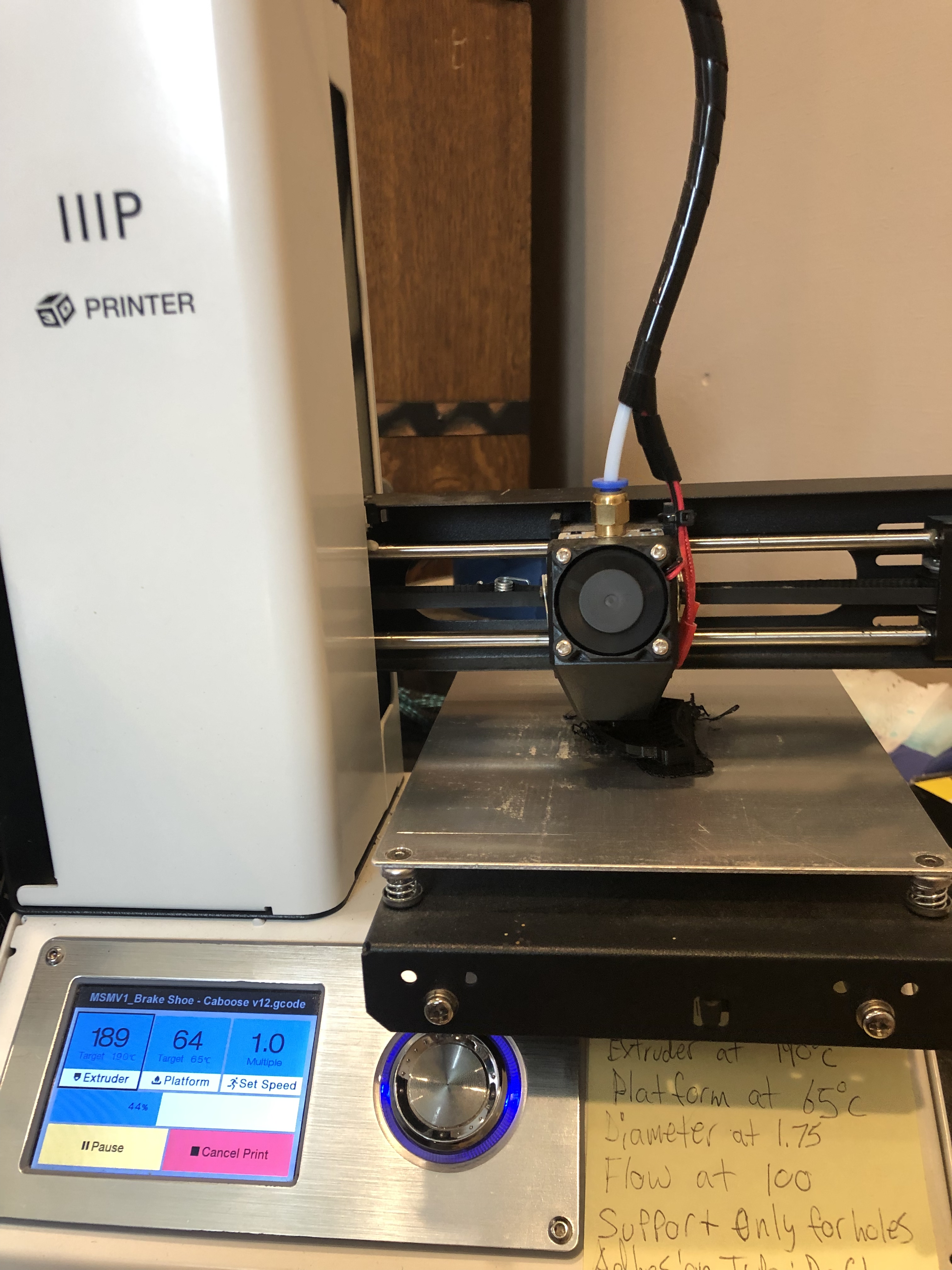 Printing a brake shoe in black PLA on low-cost 3D printer. Photo by Daris A Nevil, April 2019.