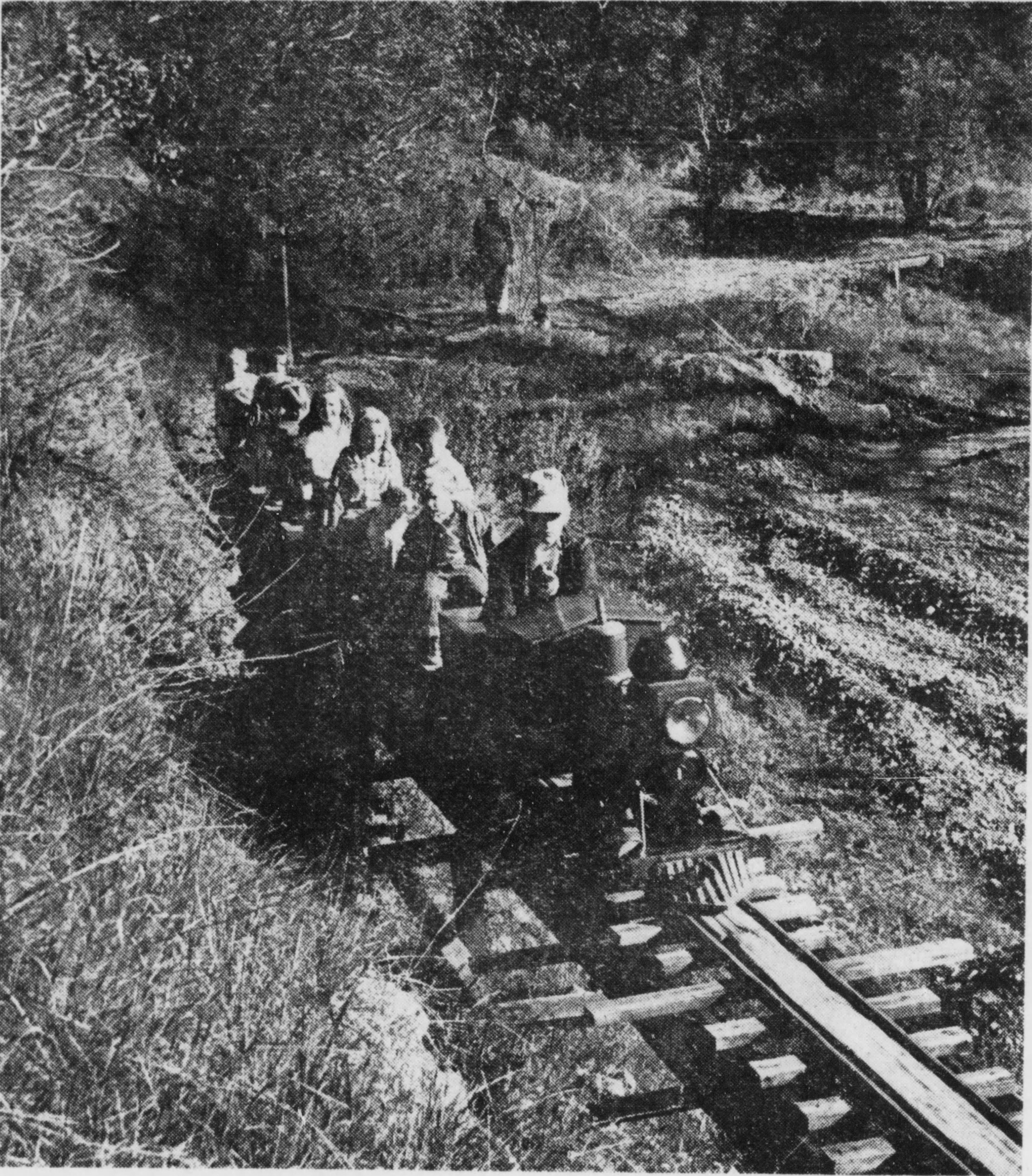 Heading back toward the depot area, the Raccoon Gulch Lines train crosses the railroad's highest trestle. In the background at right are trees around which the end of the line curves and reverses itself. Operations are done at slow speed with real railroad safety precautions and it's a big thrill for the young passengers. From Independent-Journal, Saturday, March 18, 1961