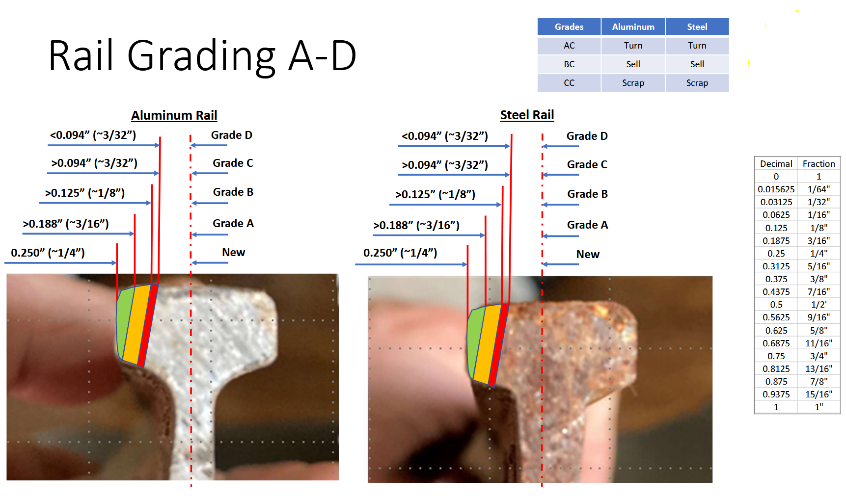 Rail Grading showing 3 wear profiles, by Crispin Richards, April 2023, used with permission.