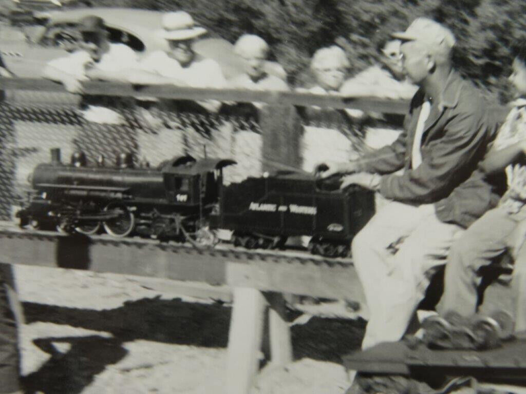 Unidentified engineer on a 1 inch scale Atlantic at GGLS Redwood Park in September 1960. Writing on the back reads "This is the engine Pat had to ride on". Photo from eBay.com offered by Ralston Antiques and Collectibles of Honolulu, Hawaii, March 2023.