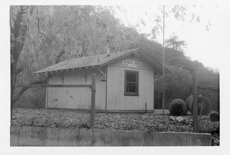 Redwood Regional Parker after abandonment, 1971. A lonely and forgotten depot with an empty flagpole waits for the trains that will never come. The open area in the fence line with the concrete wall, is where members and visitors would back their car or trailer up to, and unload their locomotives. The plans for the depot were provided by the late rail historian and author, Capt. Fredric Shaw. Early GGLS member "Bill Smith" supervised its construction. Money for the depot construction came from the proceeds of the great "Model Engineering Show" of May-1955 held in the Oakland Auditorium. Photo by Harry Dixon.