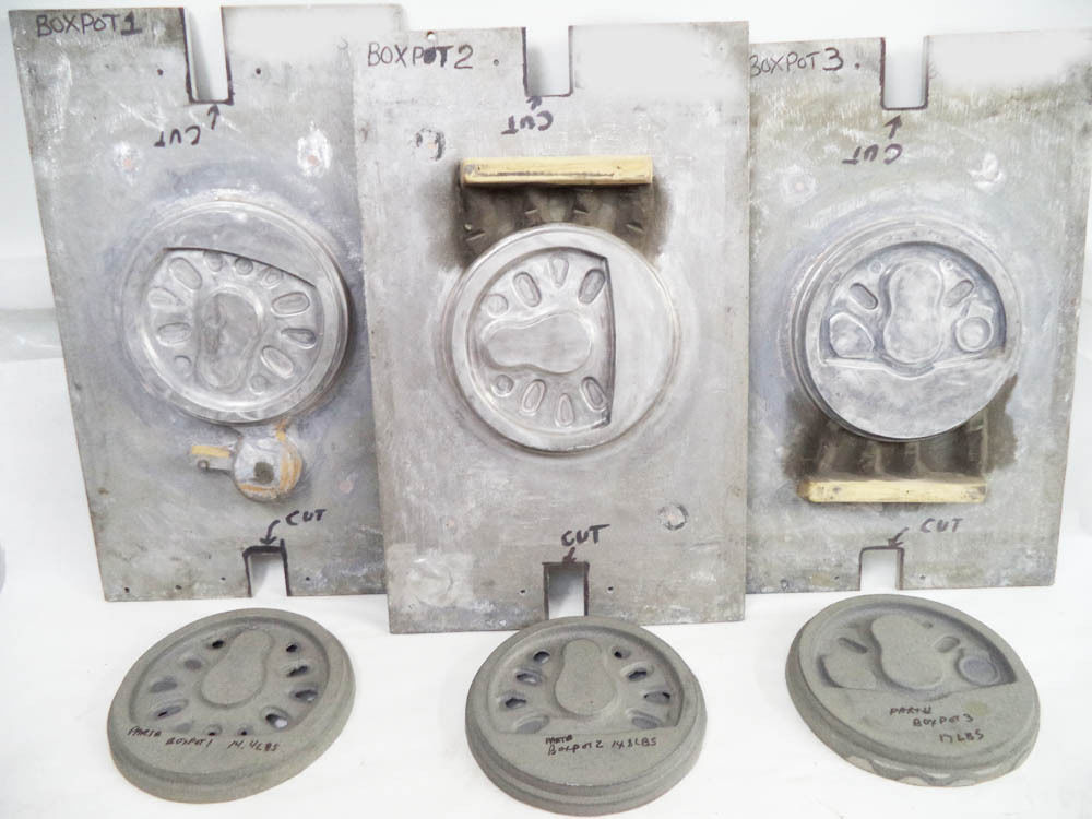 1-1/2 inch scale drive wheel patterns, boxpok style, light, medium and heavy counterweight. These were from the Richard Thomas collection. Includes 3 Solid Aluminum match plate patterns. Includes the insert detail pattern for back side of the wheels. The insert pattern is made of wood. You cut out the inserts and weld or bond to backside to create a detailed pocket. Patterns weigh 86 pounds. Castings weigh 42 pounds. Basic rough dimensions of wheel patterns are: 9.70 inch OD flange, 9.00 inch OD tire, 0.60inch tire wall thickness, 1.25 inch wheel thickness, 2 inch to 2-1/4 inch axle center to crankpin center in middle island, 1 inch to 1-1/16 inch diameter main axle wheel press fit, 5/8 inch diameter crankpin press fit. Listed in eBay February 2016.