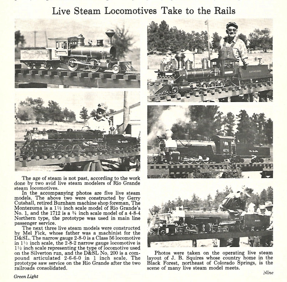 Early Colorado Live Steamers at JB Squires Black Forest Track circa mid-1970's. From "Green Light" magazine of the D&RGW.