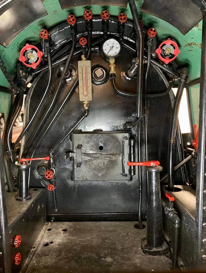 View of the cab of Santa Fe 5001 with freshly painted valves. Photo by Danny Click, 3 March 2020.