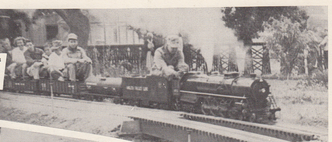 Seymour with train going by passing track. The second passenger is Clark Durkee and the fifth passenger is Marion Durkee, the son and wife of Dwight Durkee Jr. From The North American Live Steamer, Volume 1 Number 7, 1956.