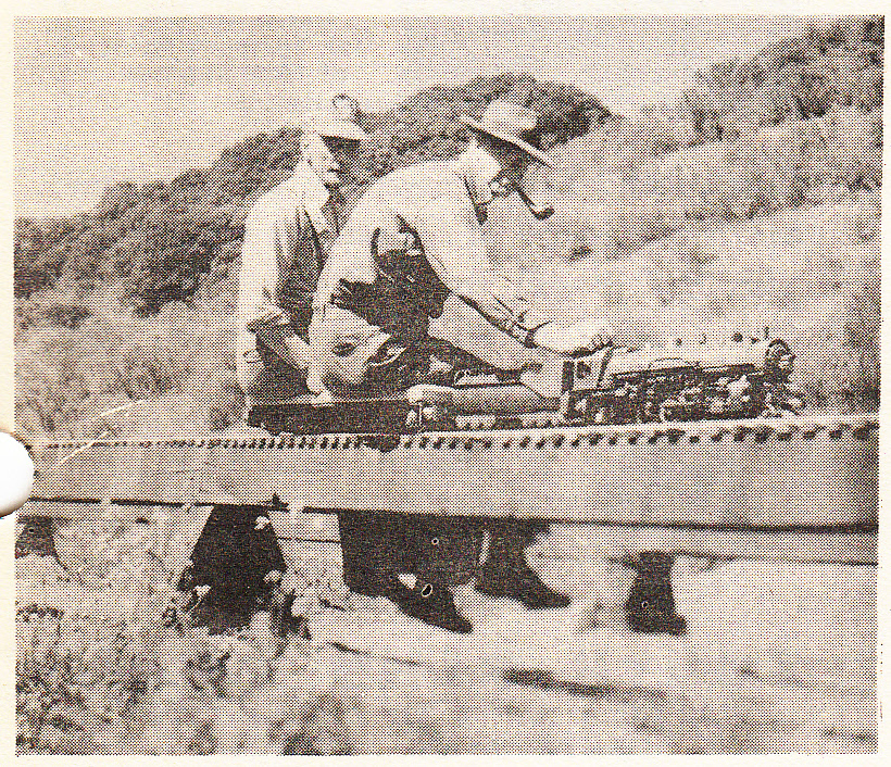 Vic Shattock and Scotty Gordon running Vic's 2-1/2 inch gauge Mikado on a section of the GGLS Redwood track in April 1950. From "The Live Steamer", July-August 1950.