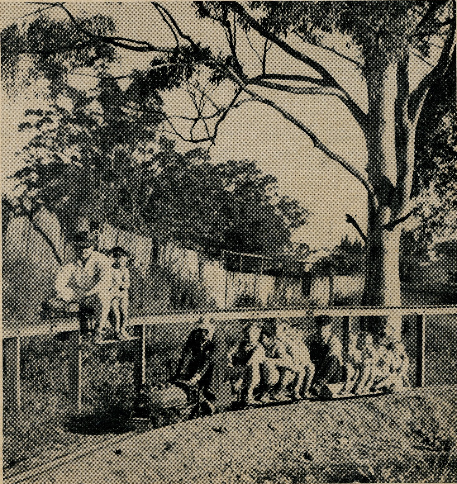 Sydney Live Steam Locomotive Society's track. The trestle accommodates 2-1/2 inch and 3-1/2 inch gauges and the track on the ground is 5 inch gauge (the British standard for 1 inch scale). From "The Miniature Locomotive", Sep-Oct 1953.