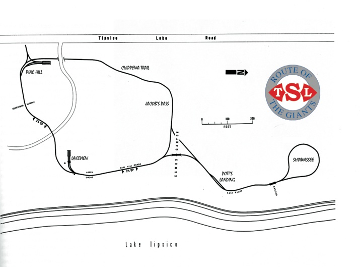 Track Layout of the 1.5 mile run of the Tipsico Lakeshore Railroad, circa 2001. From http://www.tipsicolakeshorerailroad.com/Tipsico_Lakeshore_Railroad/Track_Layout.html