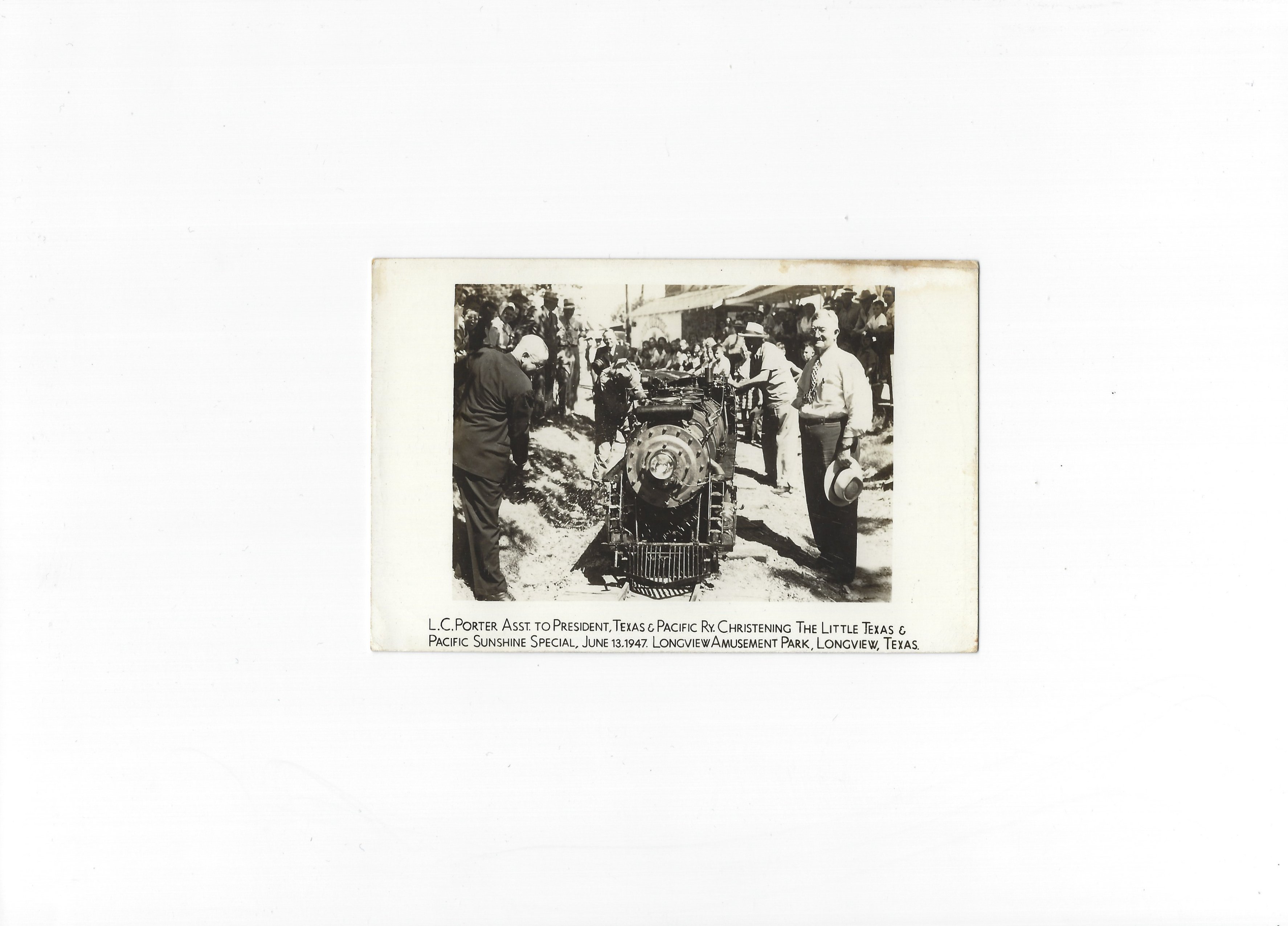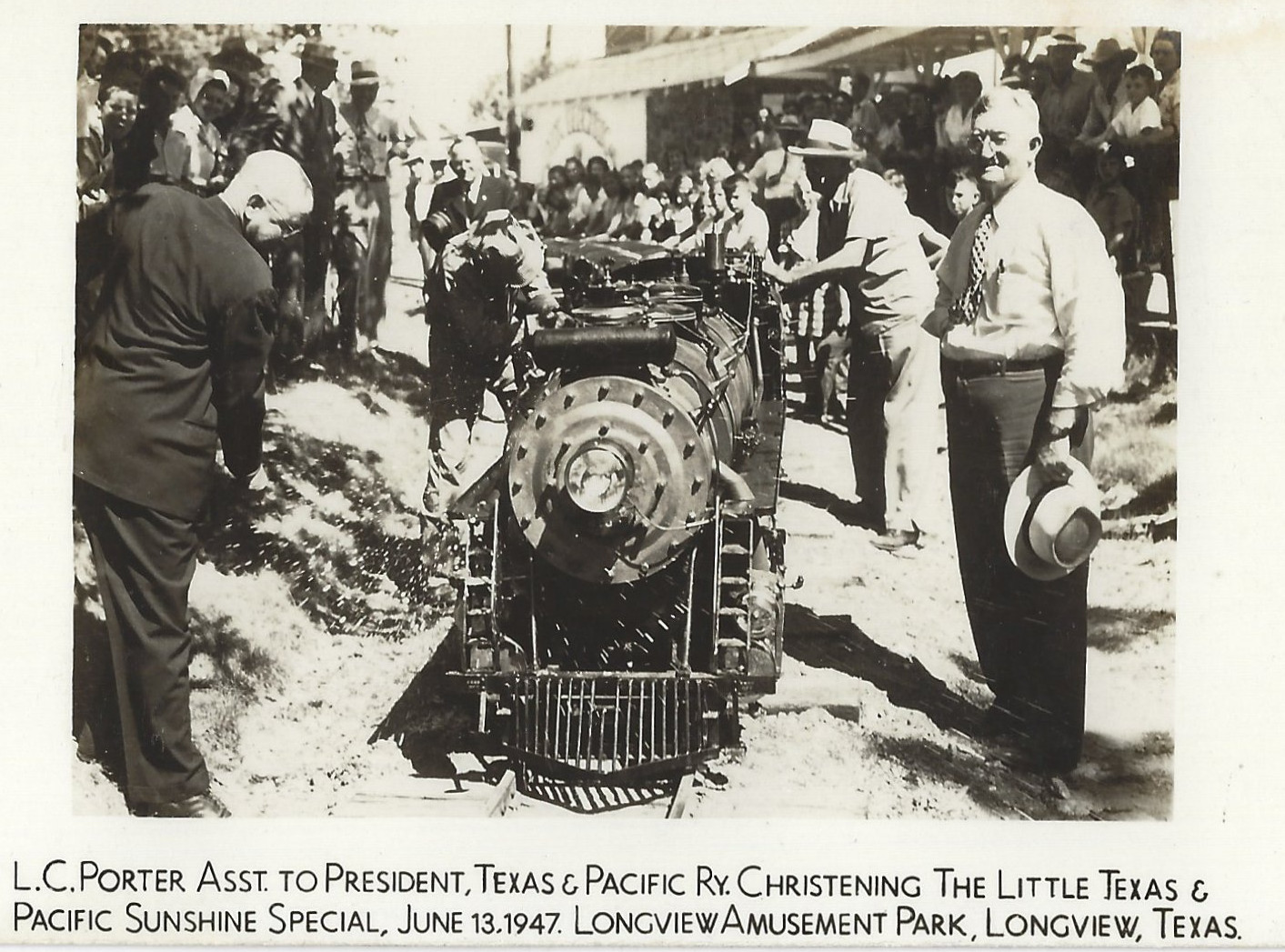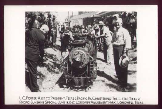 L. C. Porter, Assistant to the President of the Texas & Pacific Railway, christening The Little Texas & Pacific Sunshine Special, June 13, 1947, Longview Amusement Park, Longview, Texas. From http://www.rootsweb.ancestry.com/~txgregg/PhotoAlbum/PictureIndexLongviewCity.html