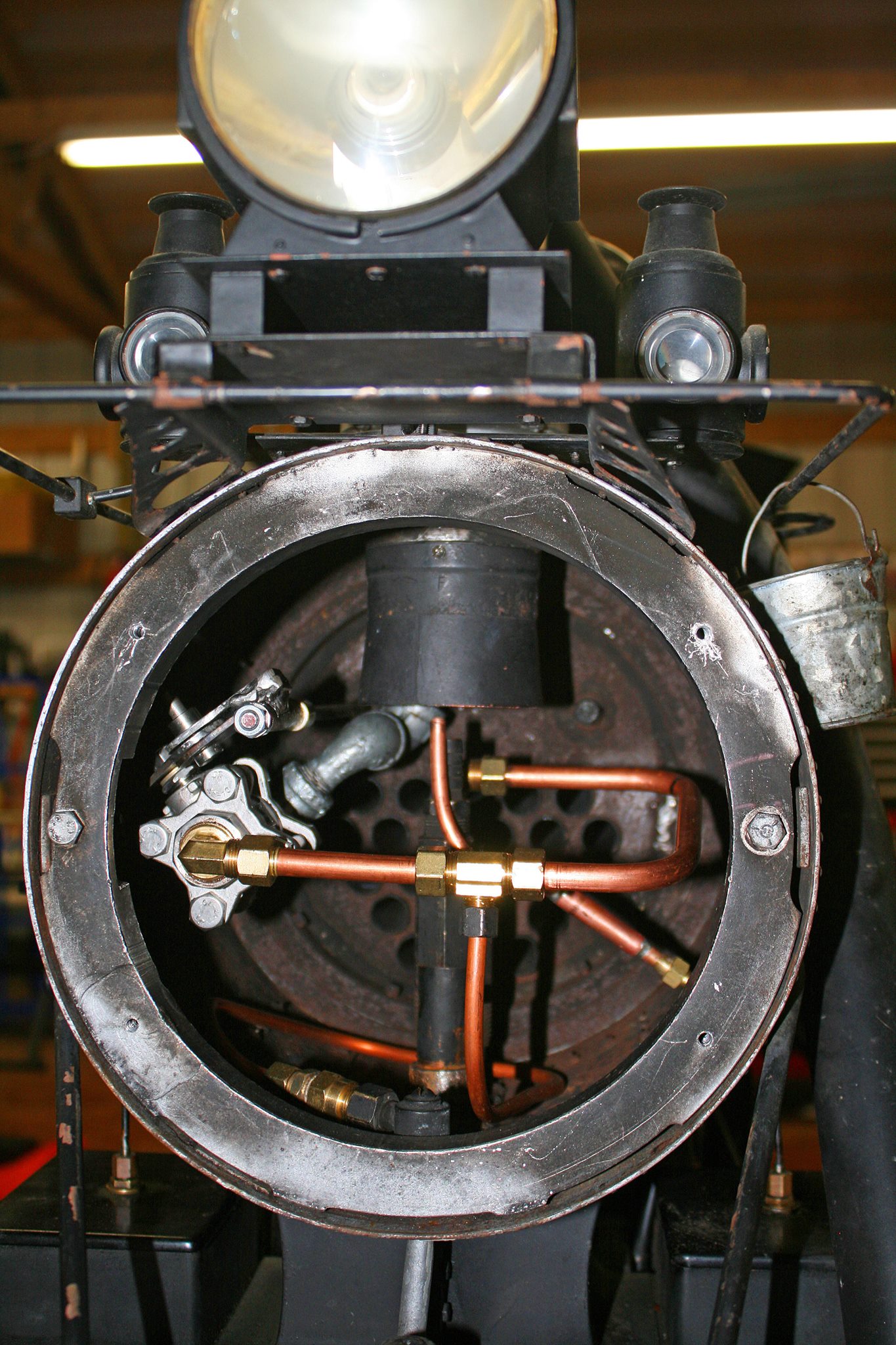 The smokebox of a locomotive with a stainless steel ball valve. Photo by Steven Hughes.