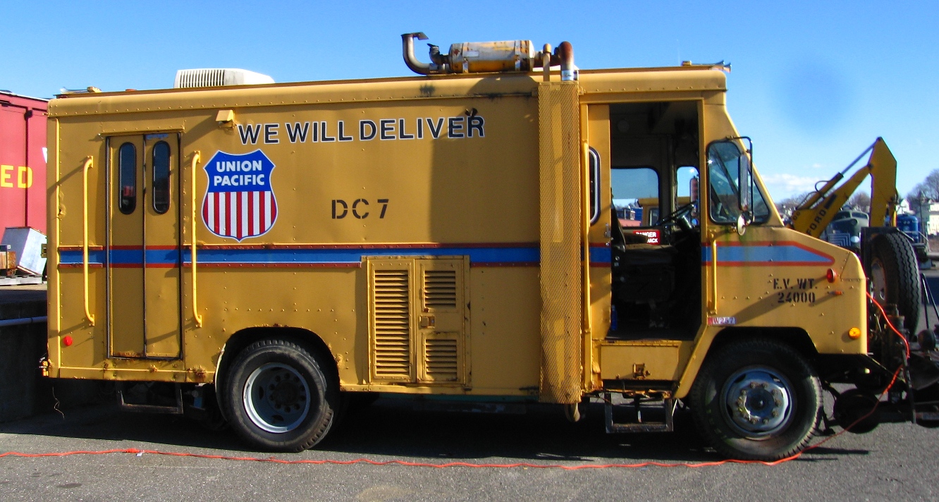 The Dapco High-Railer DC-7 has a Union City Body Company step-van body (similar to a bread delivery truck) on a Chevrolet chassis. It is equipped with railroad wheels and performs a function similar to the Sperry Rail Detector Car #135. Donated by DAPCO to The Danbury Railway Museum. From http://www.danbury.org/drm/dc7.htm