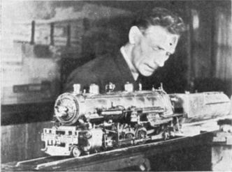 Giving the nearly finished Mike the once over. Victor Shattock's basement railroad. Model Railroader, January 1939. Photo by Lloyd Combs.