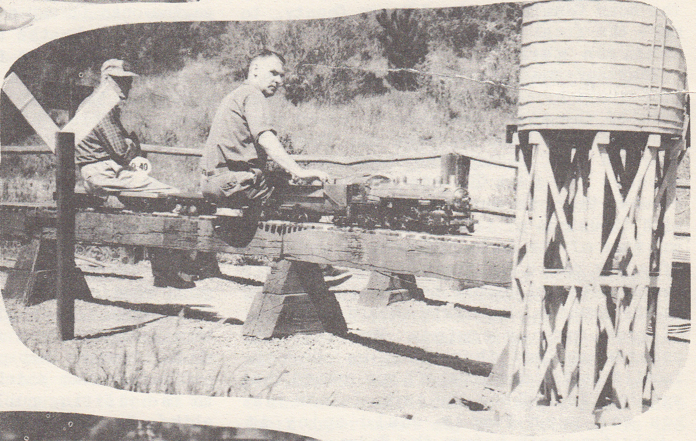 Vic Shattock as passenger behind his 3/4 inch Pacific being driven up to the water column by Carl Nordberg. From "The North American Live Steamer", Volume 1 Number 11, 1957.