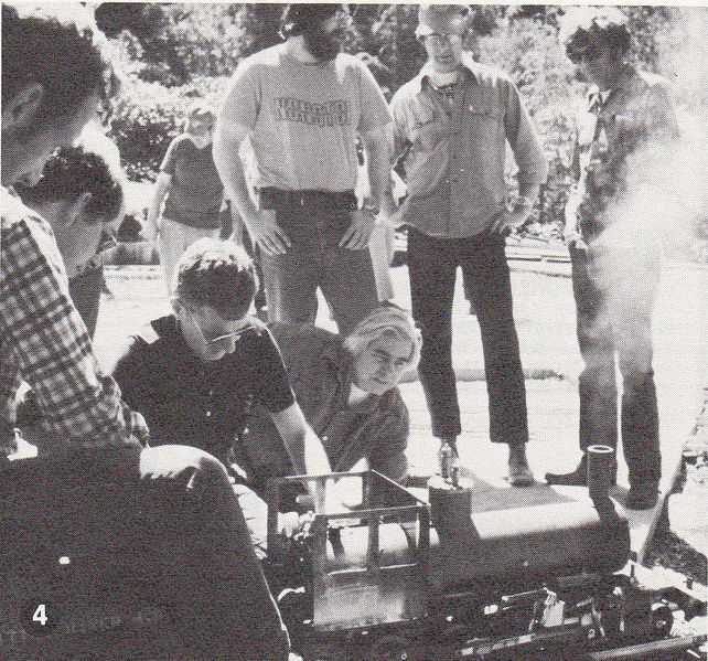 Dick Shelburg, Jacques Littlefield, Dick Thomas, Don Kepfer and (standing) Glenn Peterson, Chuck Aldrich and Tom Shine at first test run of "Baby Consolidation". Photo by Clyde Chesney, from Live Steam Magazine, July 1980.