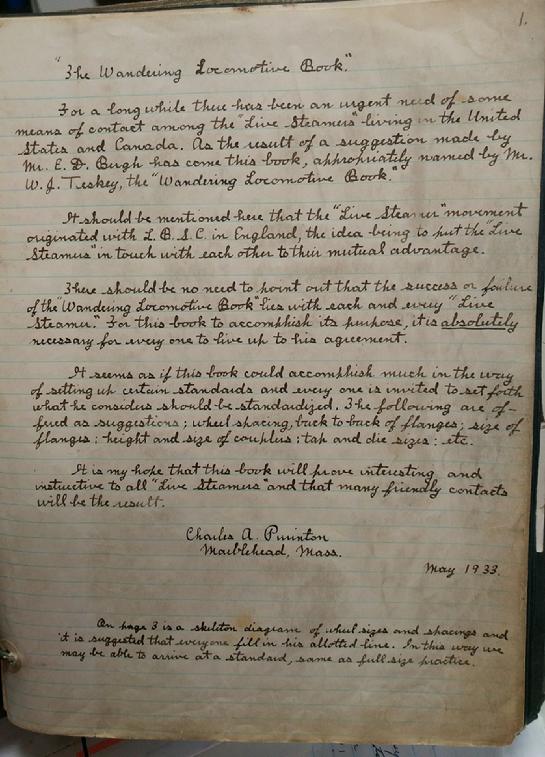 Introduction page of the Wandering Locomotive Book, Volume 1, by Carl Purinton, May 1933. Photo by John Kurdzionak. From http://www.friendsmodels.com/