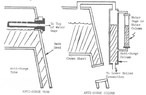The anti-surge water column, which is more easily mounted on completed boilers, is a piece of tubing with an internal diameter about twice that of the opening in the water glass. The water glass is mounted on the surge tube with the upper and lower ends of the surge tube connected to the boiler. The surge tube is generally slightly longer than the water glass.