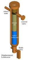 - Steam travels down the small pipe, and since the cylinder is sitting in the open, cooler air, the steam will condense back into a couple of droplets of water. Since oil is lighter than water, the water sinks to the bottom of the oil filled cylinder. The added water causes the oil level to rise above the bottom of the steam inlet tube, and a like number of drops of oil flow back through the tube, into the engine. The water has displaced the oil, giving the gadget its name.