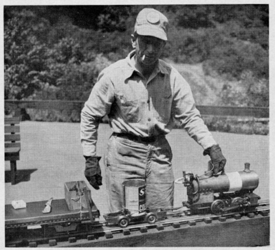 On June 9, just two months and 21 days from the time I started, she ran for the first time on steam as shown by the enclosed picture, with my left hand on the "blower" valve. The "throttle" is just an old automobile valve feeding the steam outboard around the left side with a displacement lubricator hooked into the line. The following Sunday we had the first "official" run. I fired her up again and when I was ready, Larry Duggan led off with Bill Brower next and with their whistles blowing I followed making 2-1/2 laps of our 1/4 mile track non-stop. Since then I have made nine laps non-stop pulling two people, and could have kept going but had to stop for oil. She runs fine and will spin her wheels any time I open the throttle too fast.