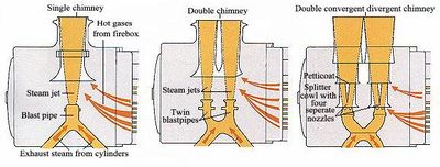 To induce the draught necessary in a locomotive firebox, exhaust steam is directed up the smokestack creating a vacuum in the smokebox and drawing air through the grate bars and fire. All gases, and we can regard exhaust steam as a gas, emerge from an orifice in the form of a cone whose total angle is approximately 10 degrees. For efficient draughting, steam from a locomotive exhaust pipe must completely fill the stack. In earlier days when stacks were tall and shapely (there were some monstrosities I will admit, but internally at least they were all similar) the 10 degree cone of exhaust steam had no difficulty filling them. Boilers, however, got fatter and stacks shorter and shorter until, unless something was done about it, the exhaust steam would pass right out to the atmosphere without going anywhere near the sides of the stack. So designers began to extend the smokestack inside the smokebox instead of outside, to provide sufficient length for the 10 degree cone to fill. Also since the smokebox gases had to be ejected by the exhaust steam, the bottom of the extension was usually flared out to a varying degree to allow the gases easy entry to the stack.