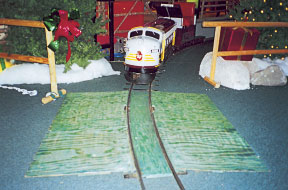 We quickly organized a roster of members and spouses to staff the 38 days. We installed the track one evening, by wheeling in a utility trailer with the track and another with our loco and three (one for standby) 8-foot-long bulkhead cars and a caboose. We bolted the 24-foot radius track together around the already completed Christmas landscape with Santa’s throne in the center. Two ramps were made out of plywood to allow pedestrians, especially those with strollers, to cross the rails and then exit. The track was tied to six big posts in the mall area by using plastic-coated clothesline wire. This stopped the circle of track from creeping. The Mall provided a wooden fence right around the track with a loading and exit opening.