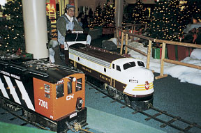We started operating the day Santa arrived and ran until Christmas Eve, and then from Boxing Day until December 28. Was it worth it? We found we had taken $13,000 in donations plus the $5,000 the Mall gave us. Our outlay was $2,500 and insurance cost $150 (added to our regular policy for our park operation). It had been so successful that we could hardly wait for next Christmas. The second year was even easier. We had the track and train in place in two hours. The club boxcab was used again. It ran flawlessly as it did the year before. When the donations box (an old bus fare box) was emptied for the last time in 1999, we had $17,000 plus the $5,000 from the Mall. Jubilation! We had big expenses building the workshop and bridges at the track for the IBLS Meet of the Millennium and this eased our worries. The third year we did the same, except Paul Roy loaned us his battery-electric 24v CPR F7 complete with digital sound. We put the boxcab in the siding for standby use.