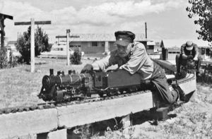 - Karl Friedrich, of Denver CO, a retired Machinist (from Pittsburgh), who became a part-time Postal Carrier after moving to Denver in the 1950's. Karl was considered an early live-steam locomotive Pioneer since constructing his first locomotive, a finely detailed freelance 3-1/2 inch gauge "Oldtime 0-6-4T" in 1925; and later designed & built the popular 0-4-0T Dinky (UPSY) locomotive in 1951; at some point he had built a nice steaming freelance 3-1/2 inch gauge "D&SL Ry" 4-4-0 American locomotive; and while living in Pittsburgh was rumored to have built one more steam locomotive, likely a 4-6-2; and by 1960 Karl had acquired an impressively large 1 inch narrow-gauge scale, 3-1/2 inch gauge "SLR" 4-6-0 + 0-6-4 Garratt locomotive, which he rarely steamed & ran; and by 1968 had built or acquired a 3-1/2 inch gauge 4-6-6-4 Challenger.