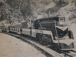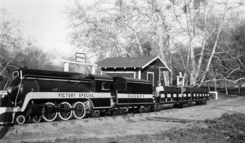 Santa Ana Canyon Miniature Railroad, "Victory Special." It was part of the Sycamore Picnic Park, which is now part of Featherly Regional Park. There was at least one tunnel and a trestle along the train's route. It was sold in 1958.