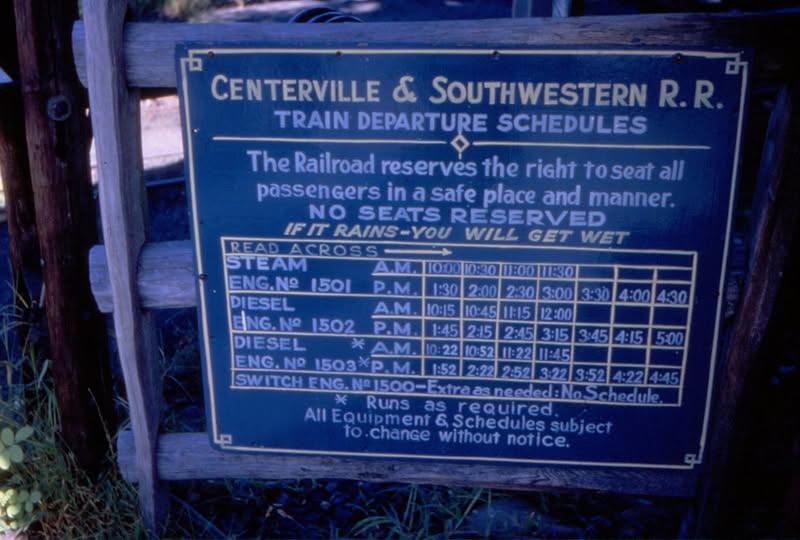 | 09:52, 27 January 2026 | CentervilleAndSouthwesternRRSchedule FredSpringer.jpg (file) | 63 KB | Dnevil | From the camera of Fred Springer we see the train departure schedule board. We see all 4 locomotives listed, STEAM ENG. No 1501. DIESEL ENG. No 1502, DIESEL ENG. No 1503 and SWITCH ENG. No 1500. Note # 1503 is listed "as required," and # 1500 - Extra as needed: No Schedule. NO SEATS RESERVED. "If it rains - you will get wet." Thanks to Keith Muldowney for providing the photo. Later versions of the same sign are now owned by the Phillipsburg Railroad Historians. From Facebook. | 1 | |