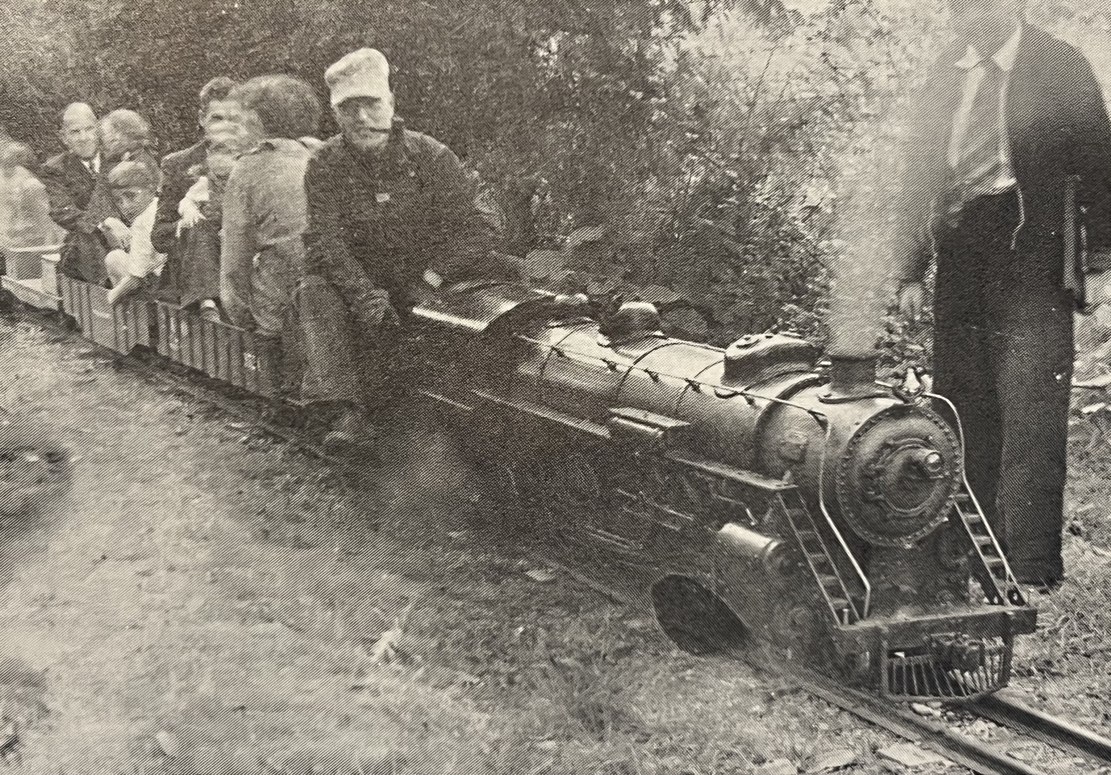 2.32 MB | Dnevil | Horace Shaw at the throttle of 4-6-2 Pacific on his Whysall Light Railroad, Summer 1938. Seated behind him is Hugh Pettis, son of Clif Pettis of Houston, Texas. Photo by Clif Pettis. From Live Steam Magazine, March 1979. | 1 |