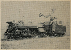 For the benefit of technically minded steam fans, the following was supplied by the builder. The locomtive is a 1-1/2 inch scale Pacific. Her boiler is 10 inches inside diameter and carries from 75 to 100 pounds pressure. Cylinders are 3 inch by 3-1/4 inch. Weight of the locomotive, according to Mr. Lakeman, is 1400 pounds in running order. Her frame alone, without boiler and cab, is 650 pounds. The forward coupler is an authentic working type, while the others are strictly link and pin units. The tender for Number 476 carries 100 pounds of coal and 20 gallons of water in addition to a seat for its combination fireman and engineman. The unit as a whole pulls seven tons.