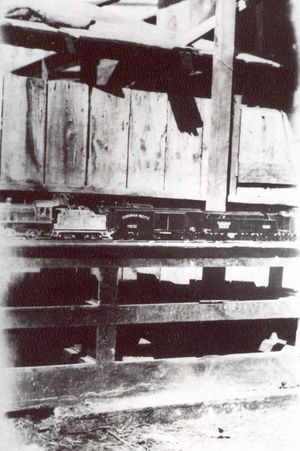 By this time Vic had three or four engines which were fired up near the turntable adjacent to where the water tank was located. Denatured alcohol was used for fuel which burned with a terrific heat in a special vaporizing burner of Vic’s own design. A blower was used during the start up procedure, the fumes being directed up the nearby chimney. Once the first engine was fired up a test run was made. If successful, a freight consist was coupled to the engine and running would commence, sometimes single-headed and sometimes double-headed. These weren't passenger hauling runs of course, just free running alcohol burning engines. Although the club later moved to outdoor facilities, the basement track continued in use for twenty-seven years until the house was torn down. At that time the track was sold to a former club member in San Francisco who set it up in his basement and used it from time-to-time for many years. About 2003 most of this original basement trackage was sold to club member Kevin Lee who lives in Northern California near the town of Yreka. It is truly amazing that after all of these many years, a large portion of Vic Shattock’s famous basement railroad trackage still exists!
